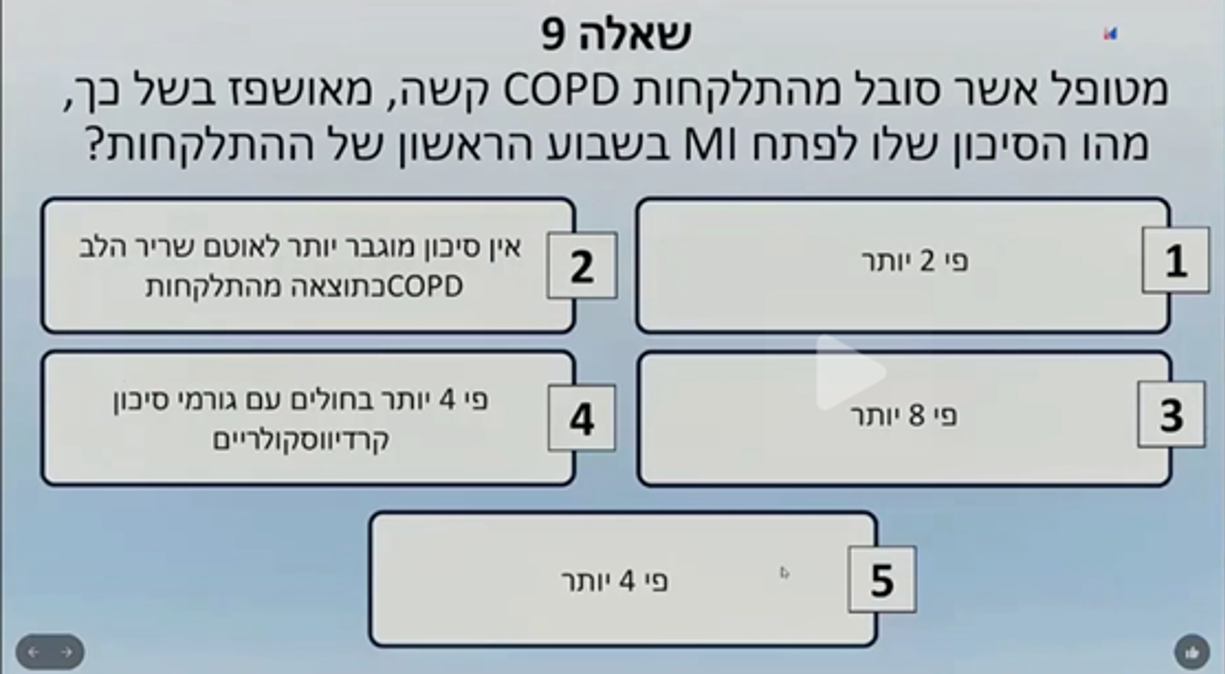 סיכון קרדיו לאחר אשפוז אירוע השקה הרצאה של ד"ר אמיר בר שי, שדן בתיאור מקרה של מטופל שחווה התלקחות קשה של COPD ומה הסיכון שלו לפתח התקף לב